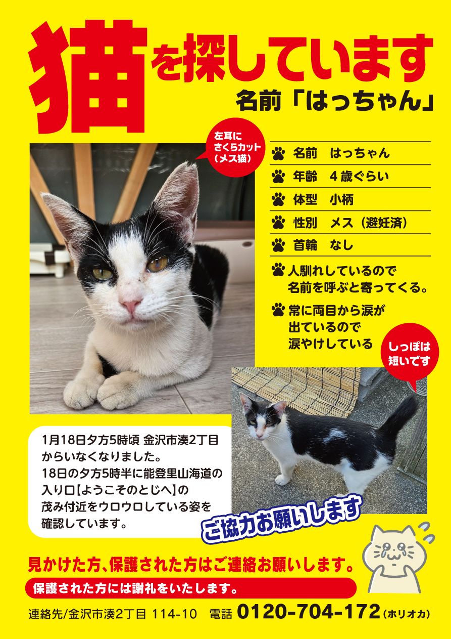 2026年01月19日 はっちゃん行方不明 はっちゃんが1月18日日曜日の17時ごろ行方不明になりました😿 おそらくは千鳥台か向陽台あたりにいるかと思いますが・・・・ 今日みんなで捜索しましたが見つかりませんでした。 はっちゃん見かけた方ご連絡下さい。 2年前に瀕死の状態で家にきた猫です。 こんなに大きくなり元気に過ごしていました。 大変人懐 … 続きを読む >